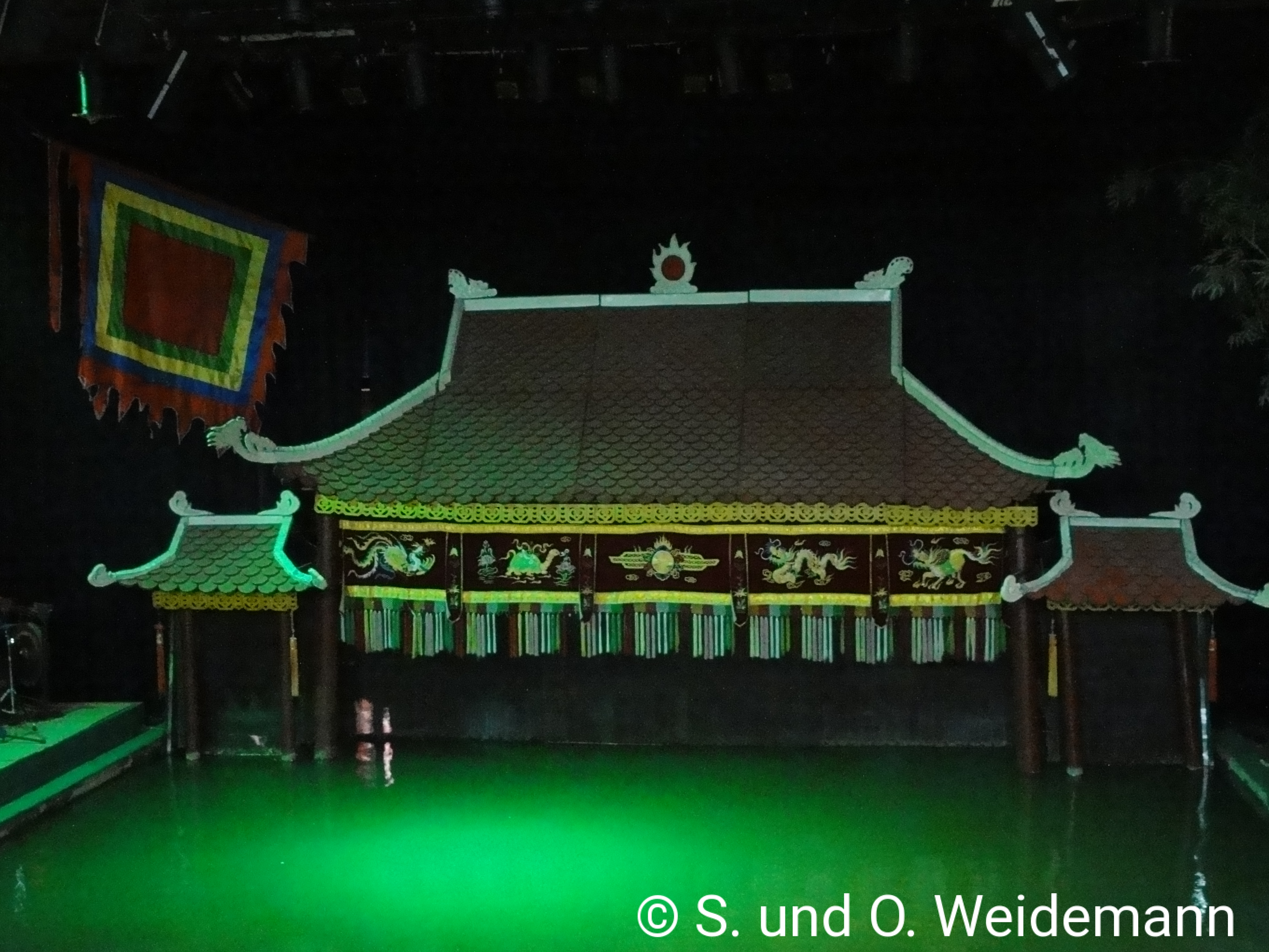 Nach dem Einchecken im Hotel Larosa und eineinhalb Stunden seligen Schlafens erfolgt der Aufbruch zum Abendprogramm. Es geht ins Wasserpuppentheater, welches interessant und für europäische Ohren gewöhnungsbedürftig ist. Wir bewundern die Leistung und Präzision der Puppenspieler. Danach gibt es ein Menü in einem gehobenen Restaurant und eine Fahrt durch das nächtliche Hanoi zum Ho-Chi-Minh-Mausoleum. Wir fahren nur vorbei, es ist ohnehin im Oktober und November geschlossen. 2 Parolen sind dort in Stein gemeißelt. “Es lebe unsere sozialistische Republik Vietnam.” und “Unser großer Präsident Ho-Chi-Minh lebt in unserer Entwicklung weiter.”. Es ist 21:26 Uhr und wir stellen aufgrund typischer Geräusche fest, dass sich direkt über uns das Fitnessstudio des Hotels befinden muss. 🙁